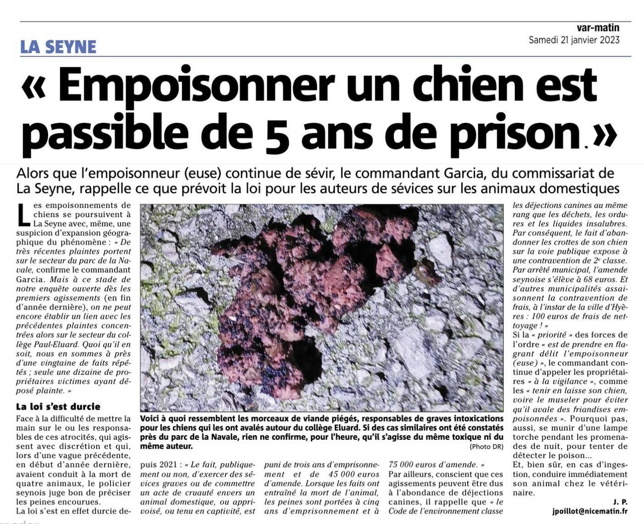 Empoisonnement des chiens La Seyne sur mer Pour rappel : Article de loi – Point 5 Partager : Partager sur Facebook(ouvre dans une nouvelle fenêtre) Facebook J’aime chargement…