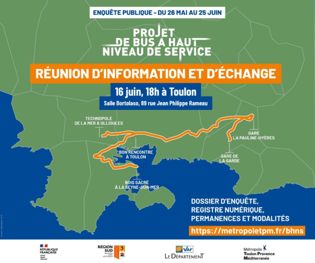 Enquête publique BHNS – Participez à la réunion publique le 16 juin à Toulon. Un temps d’information et d’échange pour tout comprendre sur le projet de Bus à Haut Niveau de Service (BHNS).