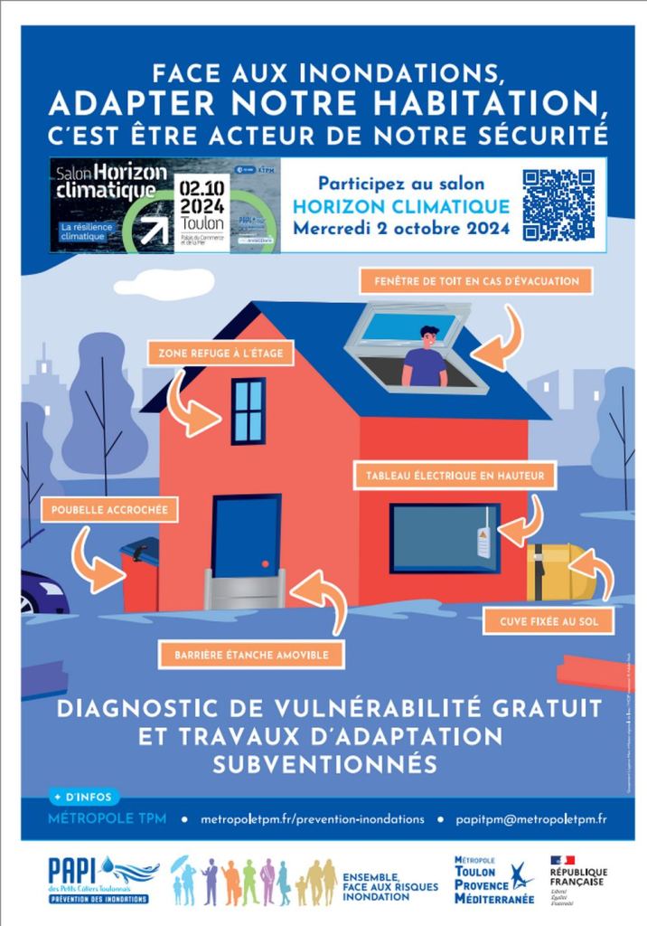 La Métropole TPM et la Chambre de Commerce et d’Industrie du Var organise un évènement inédit sur le territoire pour les particuliers et les entreprises qui souhaitent se protéger face aux risques d’inondation : le Salon « Horizon climatique » le mercredi 02/10 de 9h à 13h au Palais du Commerce et de la Mer, 364 avenue de l’Infanterie de la Marine, à Toulon : https://metropoletpm.fr/agenda/salon-horizon-climatique