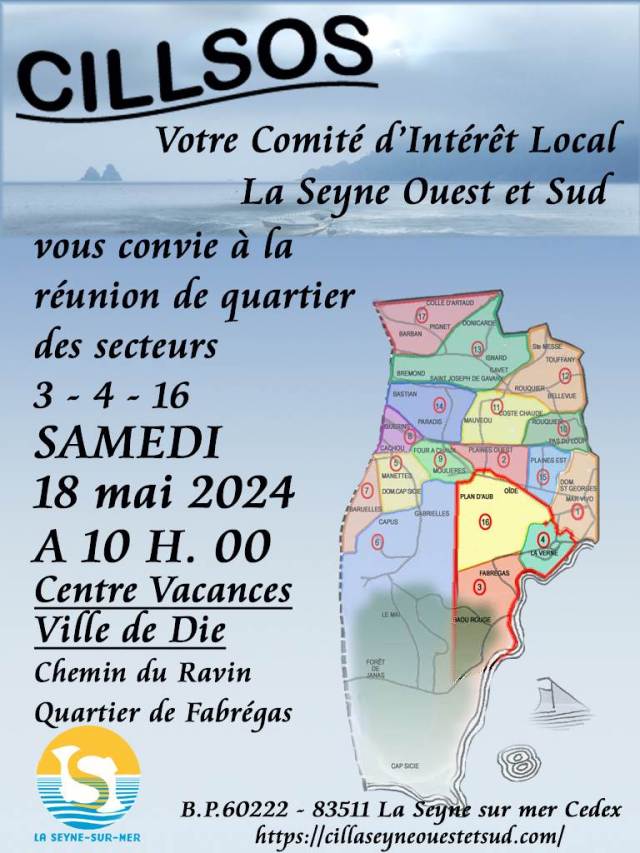 Cette réunion se tiendra au Centre de Vacances de la Ville de Die 148 V.C.N’ Chemin du Ravin, 83500 La Seyne-sur-Mer pour les secteurs 3 – 4 et 16
